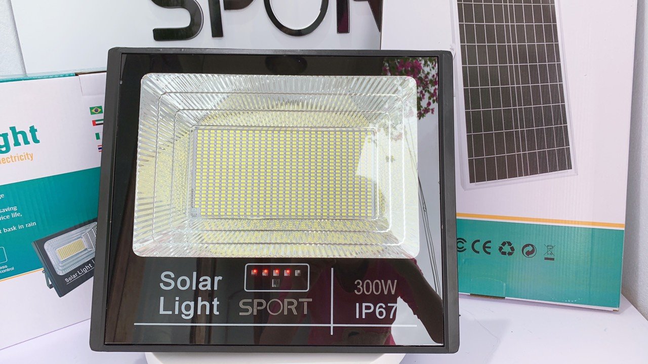 - Bộ sản phẩm bao gồm: 1 đèn pha, 1 điều khiển từ xa, 1 tấm pin năng lượng mặt trời, 1 giá đỡ tấm pin, vít nở đi kèm